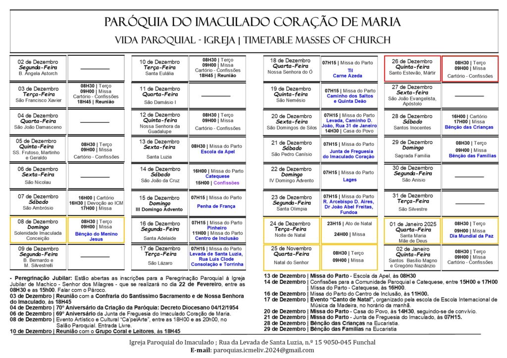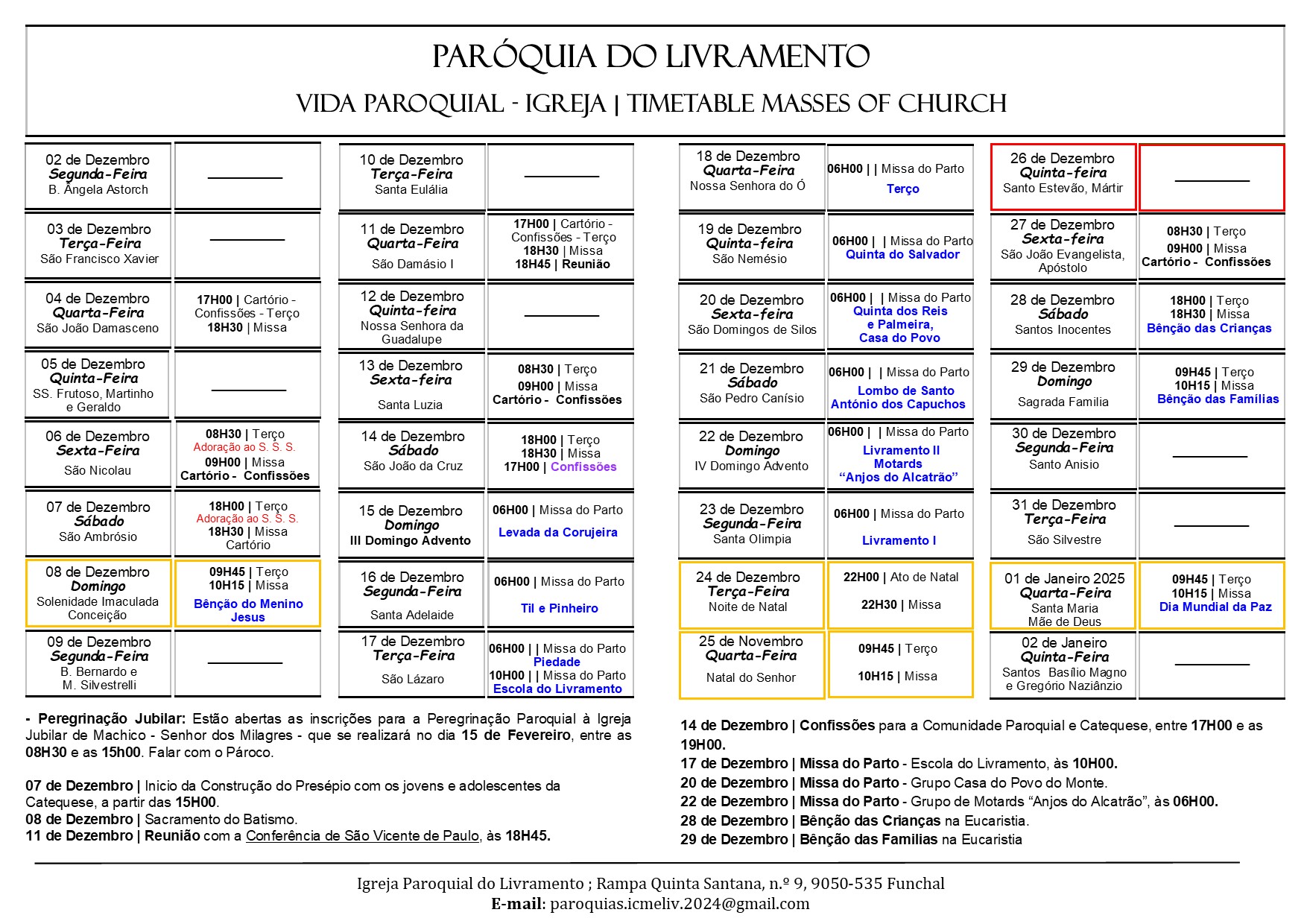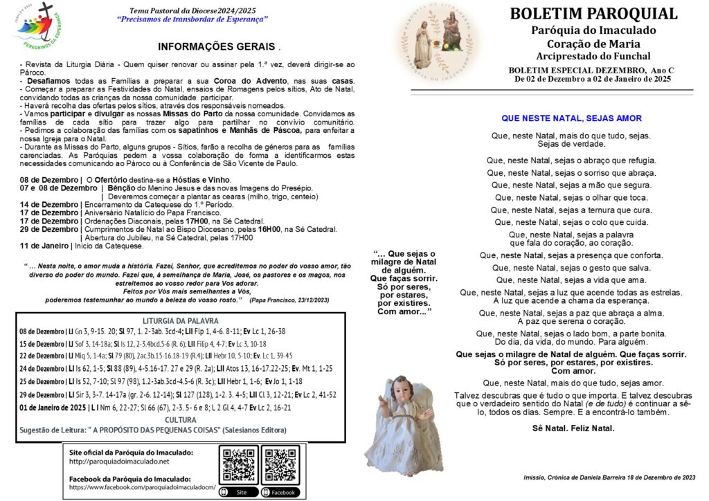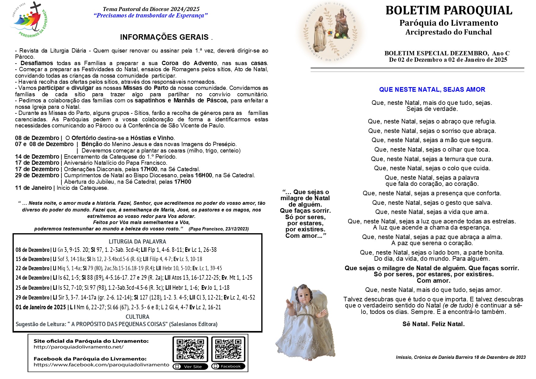 Com grande alegria, partilhamos a edição especial de dezembro do boletim paroquial da nossa comunidade do Livramento. Este boletim contém informações e reflexões que nos ajudam a preparar espiritualmente para o Advento e para o Natal, num tempo tão especial de fé e comunhão.